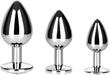 Discover new heights of pleasure with this set of three aluminum anal plugs. Each plug ranges from 7 to 9.5 cm in length and 1 to 4 cm in diameter, allowing you to gradually intensify the sensations.